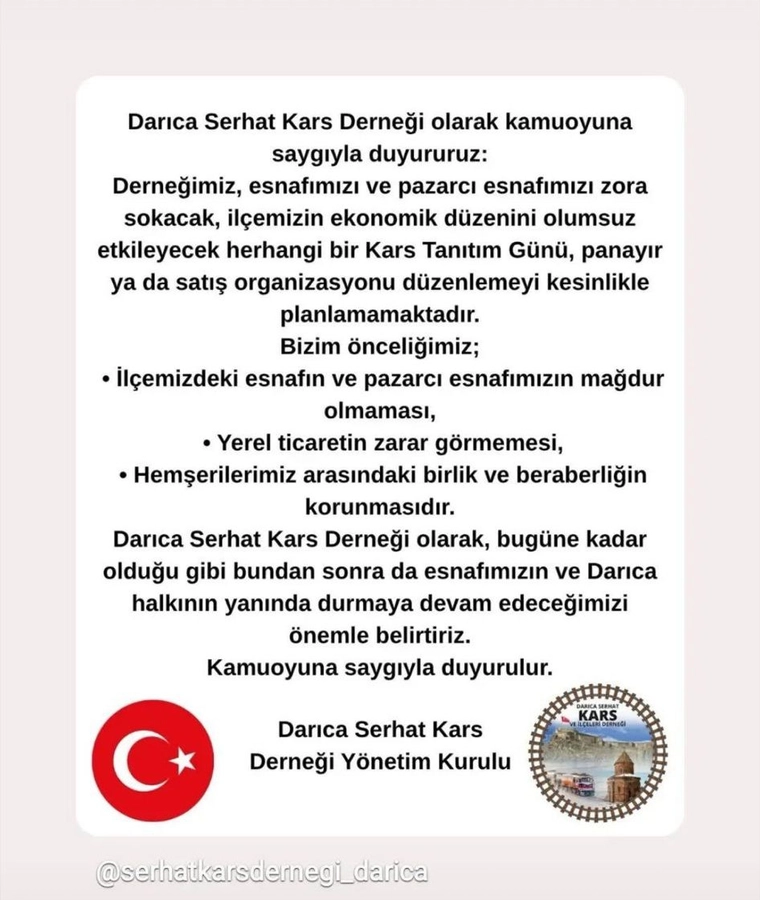 Darıca Serhat Kars Derneği Yönetim Kurulu açıklamasında, bugüne kadar olduğu gibi bundan sonra da esnafın, pazarcının ve Darıca halkının yanında durmaya kararlılıkla devam edileceğinin altı çizildi. Açıklama, “Kamuoyuna saygıyla duyurulur” ifadesiyle sona erdi.