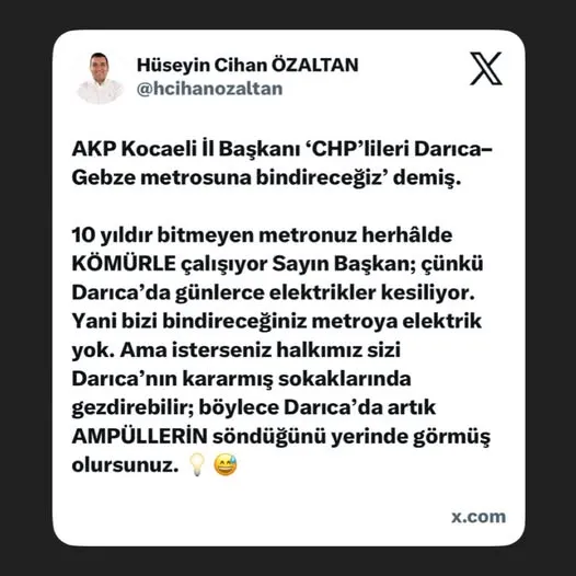 Cumhuriyet Halk Partisinin Kocaelide ki dinamosu Darıca ilçe başkanı Hüseyin Cihan Özaltan ise gerek sosyal medya paylaşımı gerek bizlere yaptığı açıklamalarda şu sözler ile Talusa yüklendi. ‘’ Sayın başkan Darıca’da elektrik yok ama metro var… En azından anlatılana göre. 10 yıldır bitmeyen bu metro herhâlde kömürle çalışıyor. Gelin sizi halkımız Darıcanın karanlık sokaklarında gezdirsin ; Darıca'da ampuller sönük, vaatler parlak.”